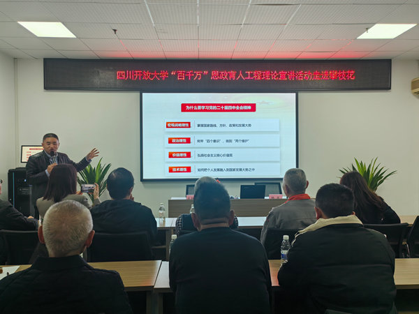 攀枝花开放大学深入社区开展党的二十届 四中全会精神主题宣讲活动 12月8日下午,攀枝花开放大学积极响应四川开放大学“百千万”思政育人工程部署要求,特邀四川开放大学马克思主义学院杨波教授,赴攀枝花市东区炳草岗街道紫荆山社区开展党的二十届四中全会精神主题宣讲活动。活动由攀枝花开放大学党委书记、校长宋玉霞主持,紫荆山社区党员干部、居民代表及攀枝花开放大学第二党支部全体党员参加。