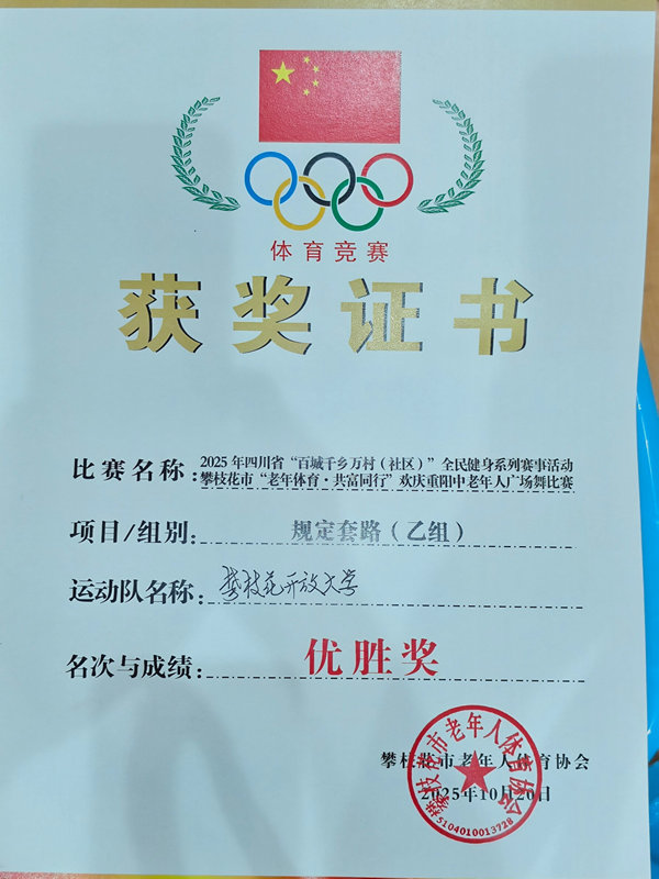 10月29日——30日,2025年四川省“百城千乡万村(社区)”全民健身系列赛事活动暨攀枝花市“老年体育·共富同行”欢庆重阳老年体育展示活动与中老年广场舞比赛在西区玉泉广场成功举办。东区、西区、仁和区等县(区)代表队及市级各部门、重点企业、基层社区等多支队伍同台比拼,竞争激烈。攀枝花开放大学(市社区大学)健身球操表演队代表市老体协参加比赛,竞赛项目规定套路《我们是一家》名列第三,获优胜奖。